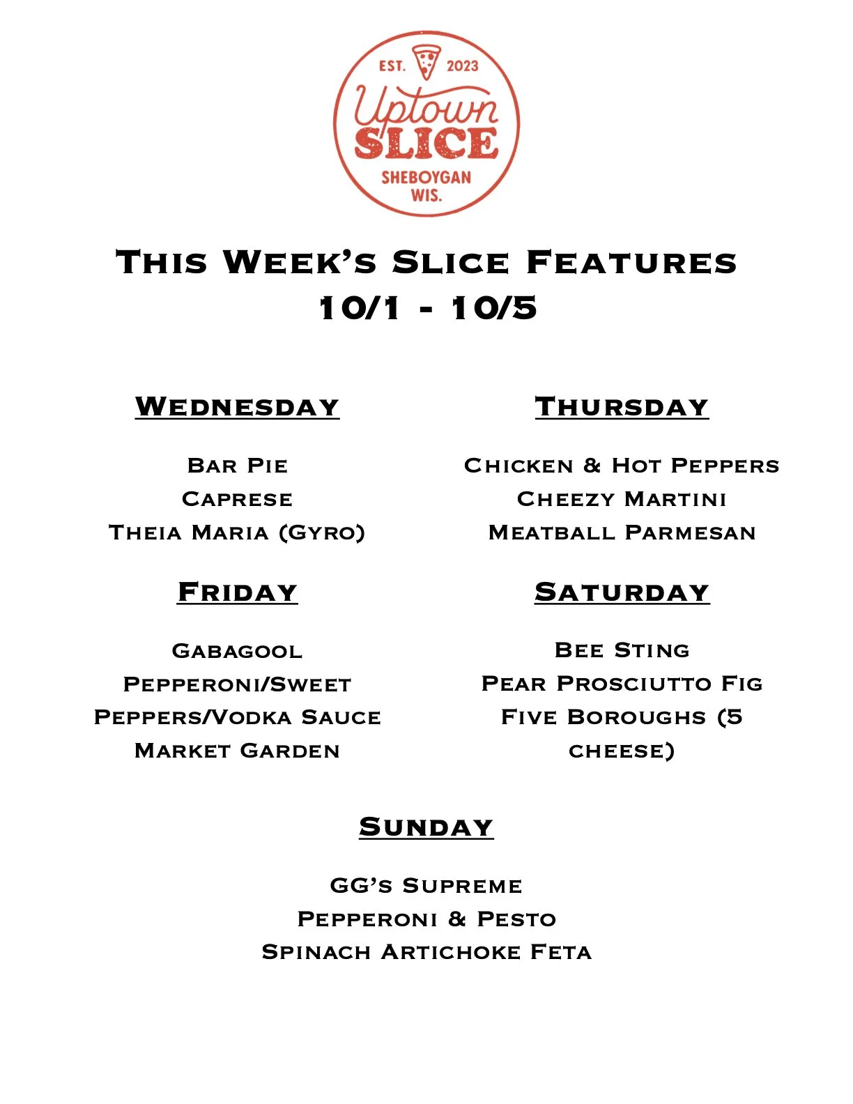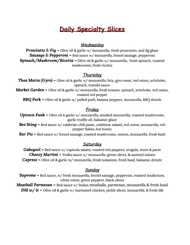 We will always have our NY Classics in the slice case: Cheese, Sausage, Pepperoni, as well as Burrata Arugula. Usually we have 3-4 specialty slices as well, which we will update here and post on our social media channels every Tuesday before our week starts!